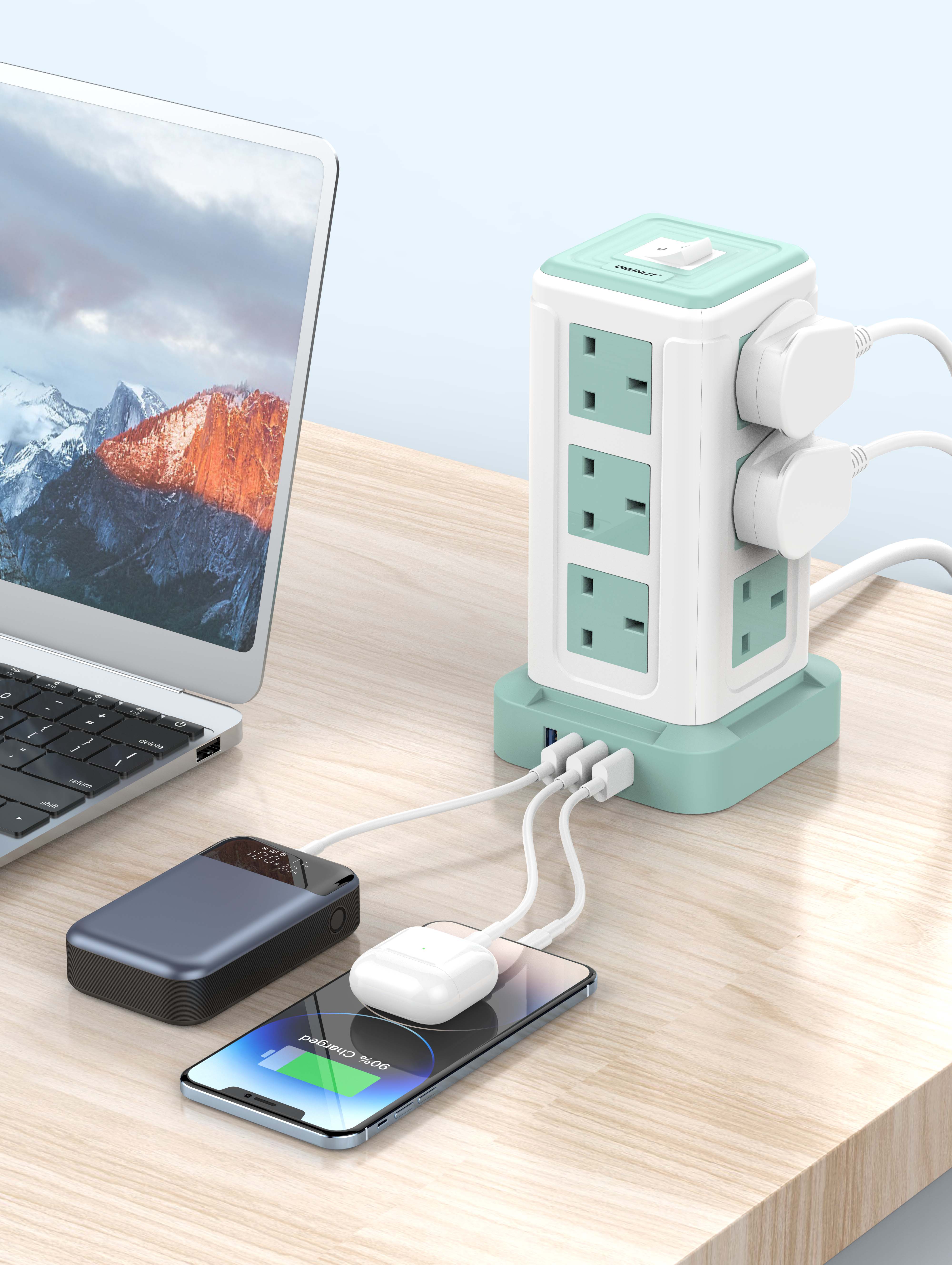 • Power Capacity: 13A Max, 3250W (250V) with 12 AC outlets and 4 USB ports.